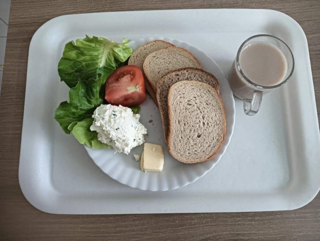 Obiad: Chleb mieszany pszenno-żytni 100 g(GLU PSZ, GLU ŻYT, )Chleb Graham 30 g ( GLU PSZ,)Masło extra 82% 15 g ( MLE,)Kawa zbożowa z mlekiem/p 250 ml(MLE, GLU ŻYT, GLU JĘCZ, )Pomidor 80 g Pasta z twarogu z koperkiem 80 g(MLE,)Sałata zielona 20 g
