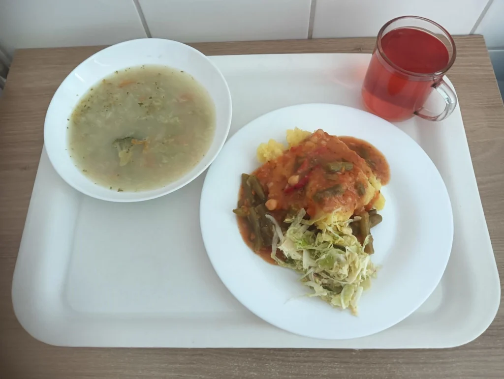Obiad: Barszcz biały z ziemniakami () 400 ml(GLU PSZ, MLE, SEL, GLU ŻYT, )Risotto z mięsem wieprzowym i warzywami () 350 g ( SEL,)Sos pomidorowy 70 ml ( GLU PSZ,)Surówka z rzodkwi, jabłka i marchewki ()150 g (MLE,)Kompot owocowy z jabłkami* z/c 250ml