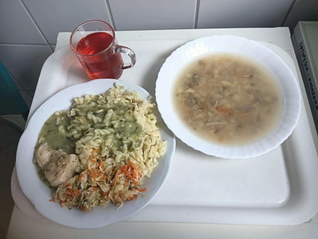 Obiad: Szpinakowa z ziemniakami ( ) 400ml (GLU PSZ, MLE, SEL, )Makaron 250 g ( GLU PSZ,)Sos boloński z mięsa wp () 150 g(GLU PSZ, MLE, SEL, )Kompot owocowy z jabłkami* z/c250 ml Surówka z selera i jabłka z olejem ()150 g (SEL,)