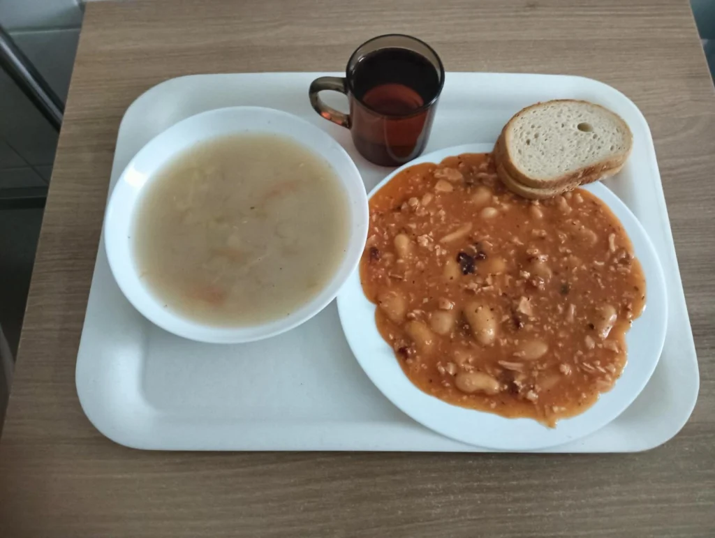 Obiad: Barszcz biały z ziemniakami () 400 ml(GLU PSZ, MLE, SEL, GLU ŻYT, )Chleb mieszany pszenno-żytni 70 g(GLU PSZ, GLU ŻYT, )Fasolka po bretońsku 350 g ( GLUPSZ, SOJ, MLE, SEL, GOR, )Kompot owocowy z jabłkami* z/c 250ml
