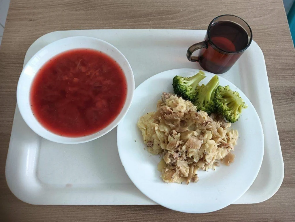 Obiad: Barszcz czerwony z ziemniakami () 400 ml ( GLUPSZ, MLE, SEL,)Łazanki z kapustą i mięs wp z łopatki 350 g(GLU PSZ, JAJ, SEL, GOR, )Brokuł gotowany* 150 g Kompot owocowy z jabłkami* z/c 250 ml