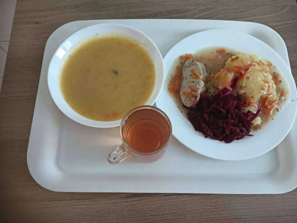 | Krem z soczewicy() 350 ml (GLU PSZ, SEL,) Ziemniaki gotowane () 250 g Zrazik drobiowy z udźca gotowany mielony 70 g (GLU PSZ, JAJ,) Sos jarzynowy () 70 ml (GLU PSZ, SEL,) Ćwikła z chrzanem () 150 g (MLE, S02,) Kompot owocowy z jabłkami* z/c 250 ml | Grysikowa () 400 ml (GLU PSZ, SEL,) Ziemniaki gotowane () 250 g Zrazik drobiowy z udźca gotowany mielony 70 g (GLU PSZ, JAJ,) Sos jarzynowy () 70 ml (GLU PSZ, SEL,) Buraczki podprawiane -drobno tarte () 150 g (GLU PSZ,) Kompot owocowy z jabłkami* z/c 250 ml | Krem z soczewicy() 350 ml (GLU PSZ, SEL,) Ziemniaki gotowane () 250 g Zrazik drobiowy z udźca gotowany mielony 70 g (GLU PSZ, JAJ,) Sos jarzynowy () 70 ml (GLU PSZ, SEL,) Ogórek kiszony z cebulką z olejem 150 g Kompot owocowy z jabłkami* b/c 250 ml |