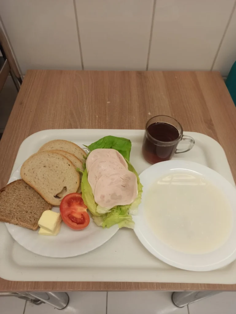 Śniadanie: Płatki jęczmienne na mleku 300ml (MLE, GLU JĘCZ,), Chleb mieszany pszenno-żytni 100g (GLU PSZ, GLU ŻYT,), Chleb Graham 30g (GLU PSZ,), Masło extra 82% 15g (MLE,), Śniadaniowa drobiowa- produkt drobiowy,parzonyw osłonce niejadalnej 50g (SOJ,), Herbata czarna granulowana z/c 250ml, Sałata zielona 20g, Pomidor 80g