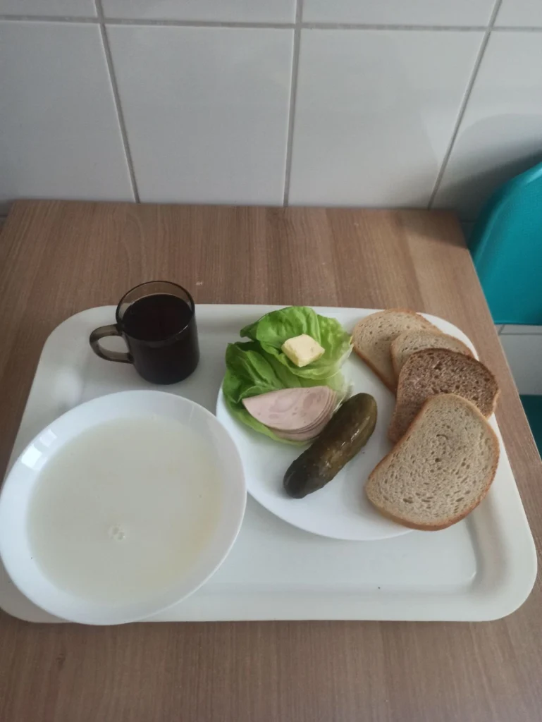 Śniadanie: Makaron drobny na mleku 300ml (GLU PSZ, JAJ, MLE,), Chleb mieszany pszenno-żytni 100g (GLU PSZ, GLU ŻYT,), Chleb Graham 30g (GLU PSZ,), Masło extra 82% 15g (MLE,), Szynka z indykiem prasowana z dodatkiem surowców wieprzowych, z połączonych kawałków mięsa, parzona 50g (SOJ,), Ogórek kiszony 80g, Herbata czarna granulowana z/c 250ml, Sałata zielona 20g