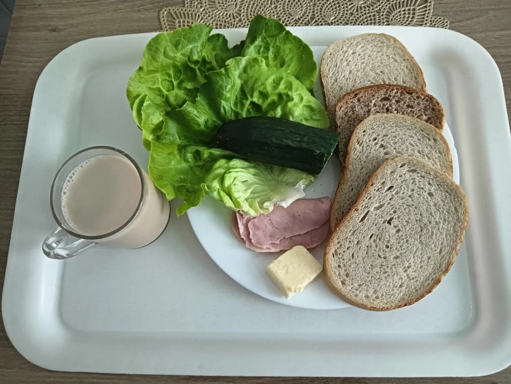 Śniadanie: Chleb mieszany pszenno-żytni 100 g (GLU PSZ, GLU ŻYT, )Chleb Graham 30 g ( GLU PSZ,)Masło extra 82% 15 g ( MLE,)Szynka z indykiem prasowana z dodatkiem surowców wieprzowych, z połączonych kawałków mięsa, parzona50 g (SOJ,)Ogórek kiszony 80 g Kawa zbożowa z mlekiem/p 250 ml(MLE, GLU ŻYT, GLU JĘCZ, )Sałata zielona 20 g