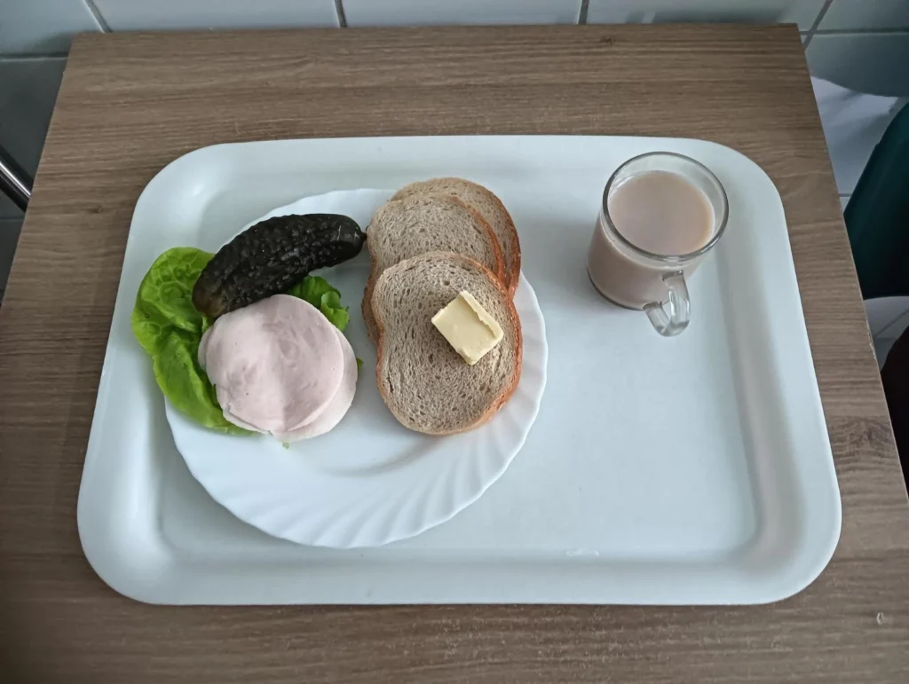 | Chleb mieszany pszenno-żytni 100 g (GLU PSZ, GLU ŻYT,) Chleb Graham 30 g (GLU PSZ,) Masło extra 82% 15 g (MLE,) Kawa zbożowa z mlekiem z/c 250 ml (MLE, GLU ŻYT, GLU JĘCZ,) Szynka Konserwowa wieprzowa,produkt blokowy wytworzony z połączonych kawałków mięsa wieprzowego, parzony 50 g (SOJ,) Ogórek kiszony 80 g Sałata zielona 20 g | Chleb mieszany pszenno-żytni 130 g (GLU PSZ, GLU ŻYT,) Masło extra 82% 15 g (MLE,) Kawa zbożowa z mlekiem z/c 250 ml (MLE, GLU ŻYT, GLU JĘCZ,) Szynka Konserwowa wieprzowa,produkt blokowy wytworzony z połączonych kawałków mięsa wieprzowego, parzony 50 g (SOJ,) Pomidor 80 g Sałata zielona 20 g | Chleb Graham 130 g (GLU PSZ,) Masło extra 82% 15 g (MLE,) Kawa zbożowa z mlekiem b/c 250 ml (MLE, GLU ŻYT, GLU JĘCZ,) Szynka Konserwowa wieprzowa,produkt blokowy wytworzony z połączonych kawałków mięsa wieprzowego, parzony 50 g (SOJ,) Ogórek kiszony 80 g Sałata zielona 20 g |