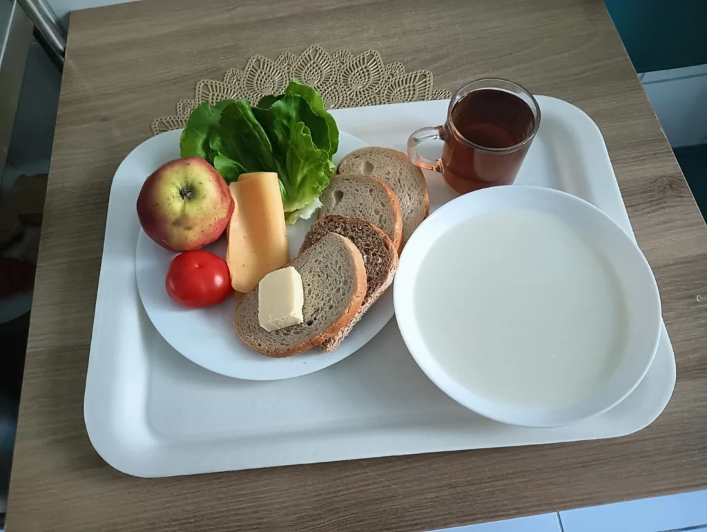 | Płatki owsiane na mleku 300 ml (MLE, GLU OW,) Chleb mieszany pszenno-żytni 100 g (GLU PSZ, GLU ŻYT,) Chleb Graham 30 g (GLU PSZ,) Masło extra 82% 15 g (MLE,) Ser żółty 50 g (MLE,) Jabłko 1 szt 1 szt Herbata czarna granulowana z/c 250 ml Pomidor 80 g Sałata zielona 20 g | Płatki owsiane na mleku 300 ml (MLE, GLU OW,) Chleb mieszany pszenno-żytni 130 g (GLU PSZ, GLU ŻYT,) Masło extra 82% 15 g (MLE,) Serek homo. naturalny 60 g (MLE,) Herbata czarna granulowana z/c 250 ml Sałata zielona 20 g Pomidor 80 g | Płatki owsiane na mleku 300 ml (MLE, GLU OW,) Chleb Graham 130 g (GLU PSZ,) Masło extra 82% 15 g (MLE,) Serek homo. naturalny 60 g (MLE,) Jabłko 1 szt 1 szt Herbata czarna granulowana b/c 250 ml Pomidor 80 g Sałata zielona 20 g |