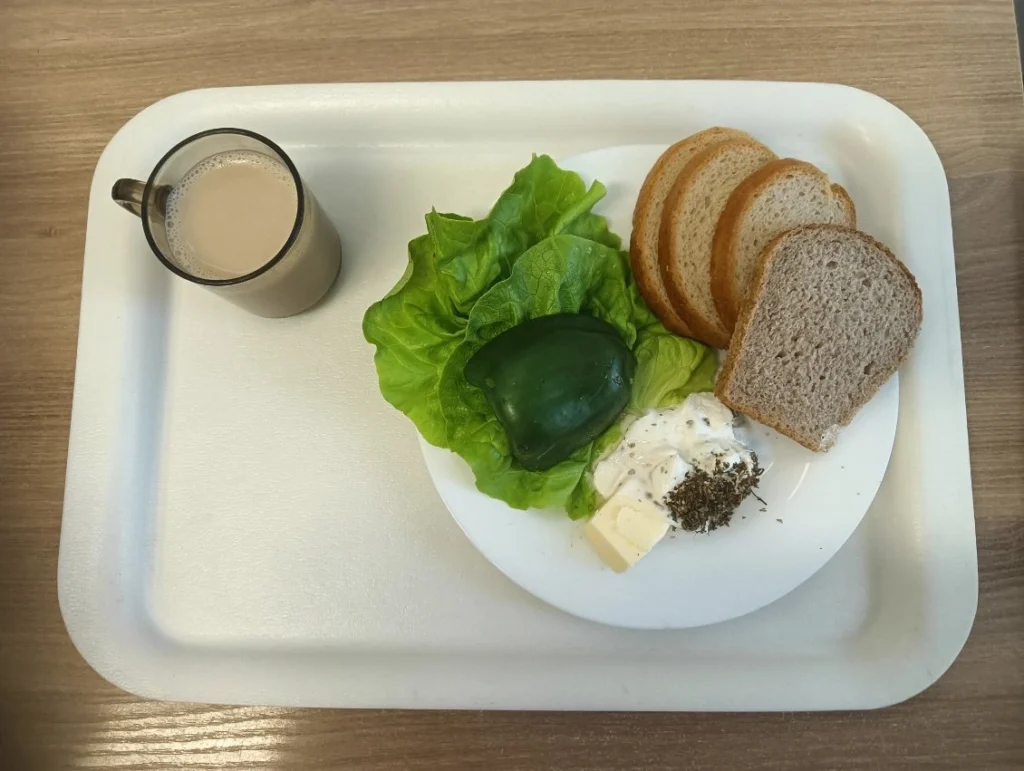 Śniadanie: Chleb mieszany pszenno-żytni 100 g(GLU PSZ, GLU ŻYT, )Chleb Graham 30 g ( GLU PSZ,)Masło extra 82% 15 g ( MLE,)Serek homo.o smaku naturalnym z ziołami 60 g (MLE,)Kawa zbożowa z mlekiem/p 250 ml(MLE, GLU ŻYT, GLU JĘCZ, )Sałata zielona 20 g Papryka świeża 80 g